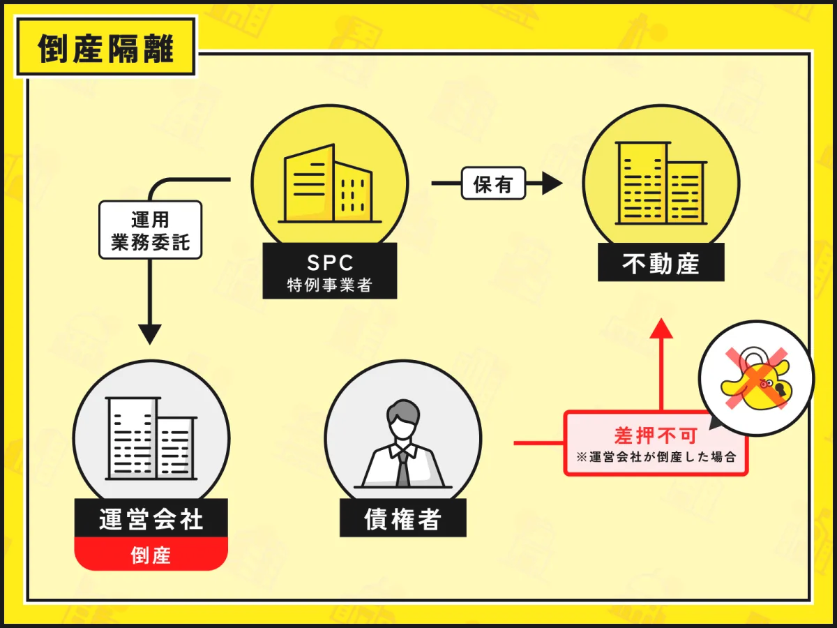 倒産隔離は、運営会社と投資家の資産を分けるスキームであり、運営会社が倒産した場合でも投資家の資産が保護されます。この方法を使用することにより、機関投資家でも安心して投資できる環境を整えています。