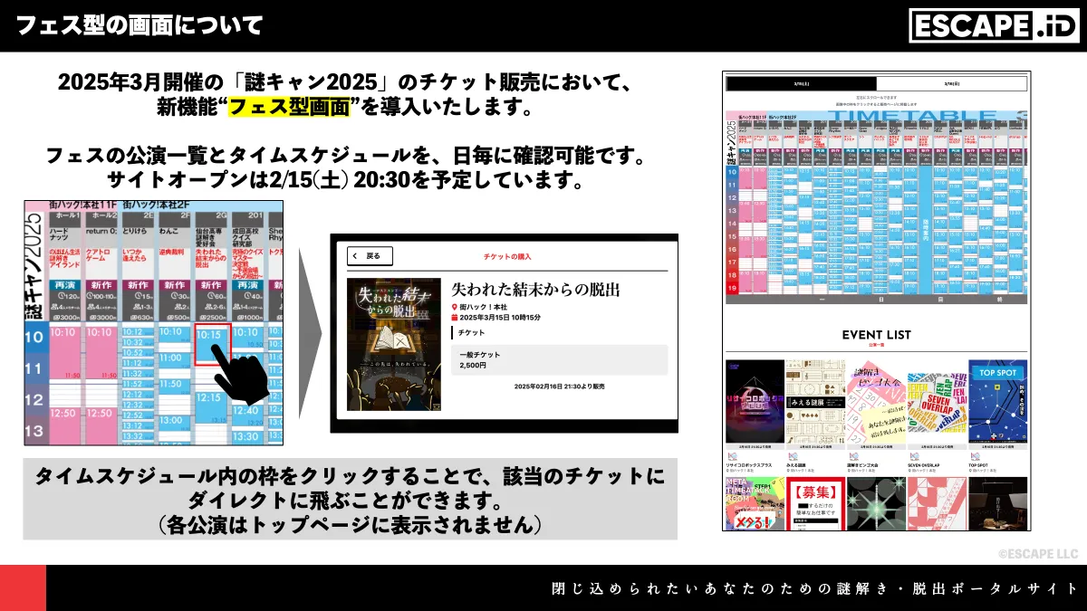 日本の謎解き・脱出ゲームシーンにおいて、ESCAPE合同会社が運営する『ESCAPE.ID』に新機能が登場しました。その名も『フェス型画面』。この新しい機能は、多彩な団体が集結するフェスタイプのイベントのチケット販売をより便利にするために開発されたものです。