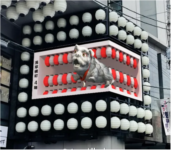 Dimpact®のトリックアートサイネージは、視覚錯覚を利用した新たな映像技術です。特定の角度から見ることで、2次元の映像がまるで飛び出しているかのように見えるこのアートは、専用のメガネやVRヘッドセットなしで楽しむことができます。まさに新機軸のデジタルサイネージであり、屋外店舗演出としての可能性を広げています。