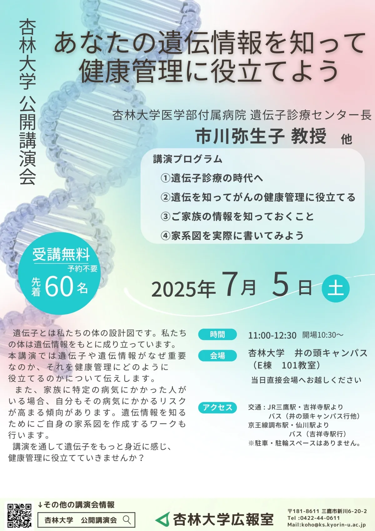 2025年7月5日(土)、杏林大学井の頭キャンパスにて「あなたの遺伝情報を知って健康管理に役立てよう」というテーマの講演会が行われます。この講演では、遺伝子の基本から、遺伝情報が健康管理にどのように活用できるかを学ぶことができます。特に、家族に特定の病気を持つ方がいる場合、そのリスクを把握し、対策を講じることが重要です。