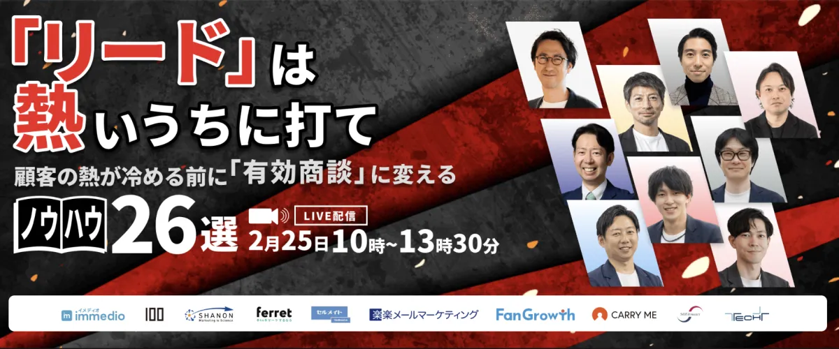 株式会社immedioが主催するカンファレンス『「リード」は熱いうちに打て』が2026年2月25日(水)に開催されます。このイベントでは、顧客の商談化における「スピード」の重要性について深く掘り下げ、9社が集結して具体的なノウハウを共有します。