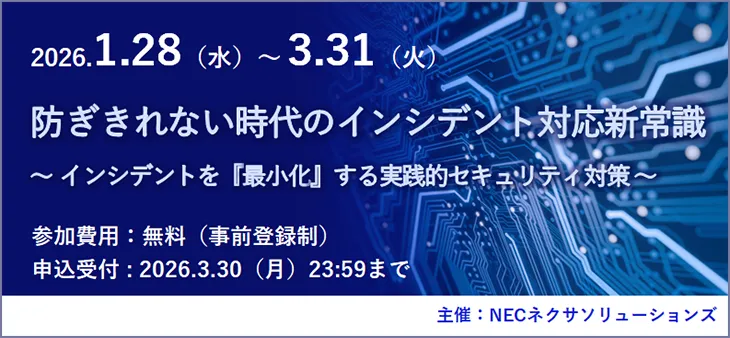 NECネクサソリューションズが提供する「防ぎきれない時代のインシデント対応新常識」セミナーが注目を集めています。このセミナーは、サイバー攻撃の脅威が日々増す中での対応力を高めることを目的としており、現在オンデマンドで視聴可能です。申込期限は2026年3月30日までで、視聴期間は3月31日までとなっています。