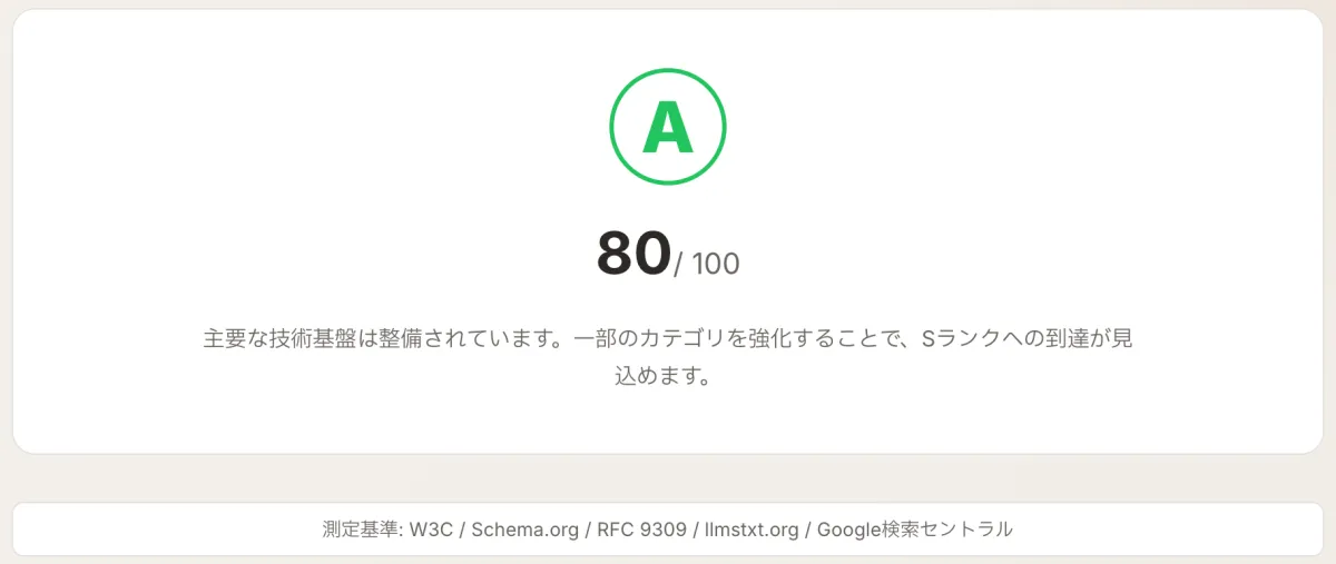 本ツールは、W3CやSchema.org、Googleの開発者ガイドラインなど、国際的に認知された技術指標に基づいてスコアを自動的に算出します。診断の項目は以下の5つに分かれており、各項目は20点満点で評価され、合計100点満点となります。