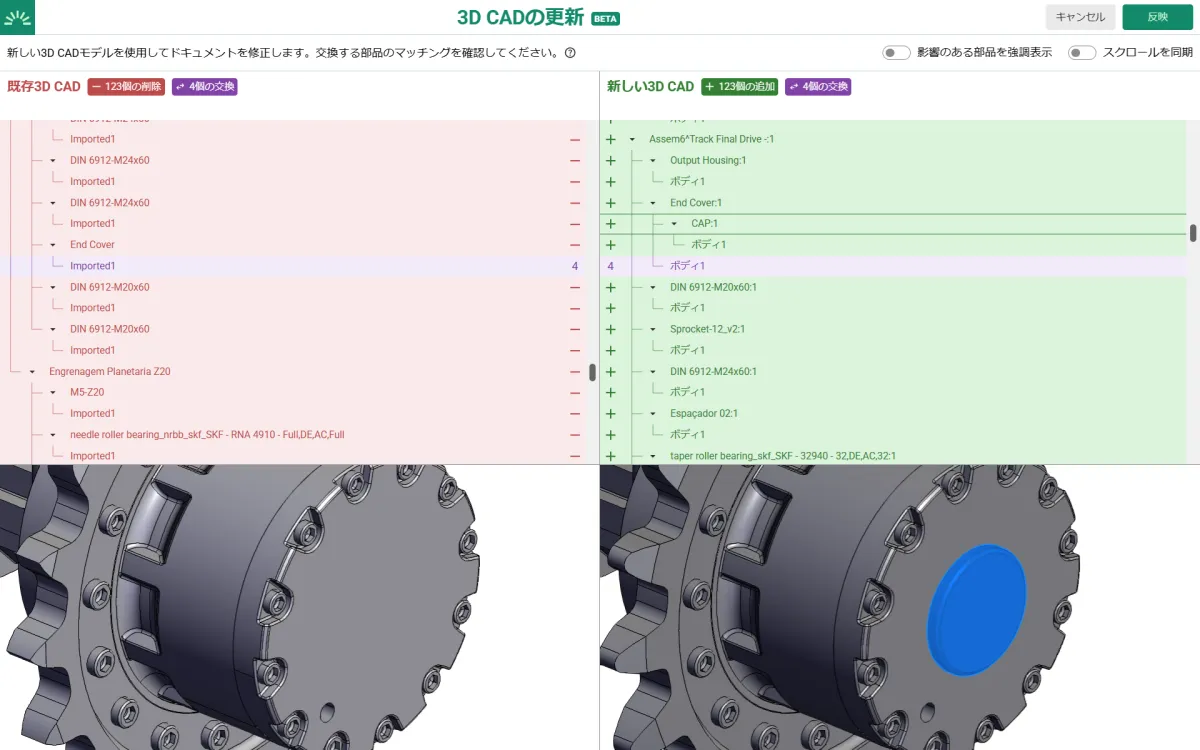 この新機能では、変更前と変更後の3Dモデル、及びパーツリストが同時に表示可能です。これにより、パーツの変更点を視覚的に確認し、手順の変更についての検討がより簡単に行えます。また、スクロールが同期され、モデルを動かすともう一方のモデルも同様に動くため、比較が非常にスムーズになります。