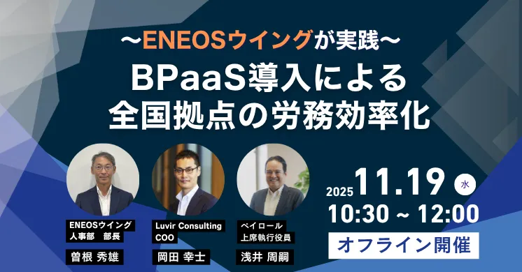 このセミナーでは、著作「図解 人的資本経営」の著者であり、組織・人事コンサルタントとしての豊富な実績を持つLuvir Consulting株式会社の岡田幸士氏が基調講演を行います。岡田氏は、労務管理の要諦や改善すべきポイントについて解説します。さらに、株式会社ENEOSウイングの人事部長である曽根秀雄氏が、実際に給与業務をBPO化することでの課題解決の体験談を語ります。