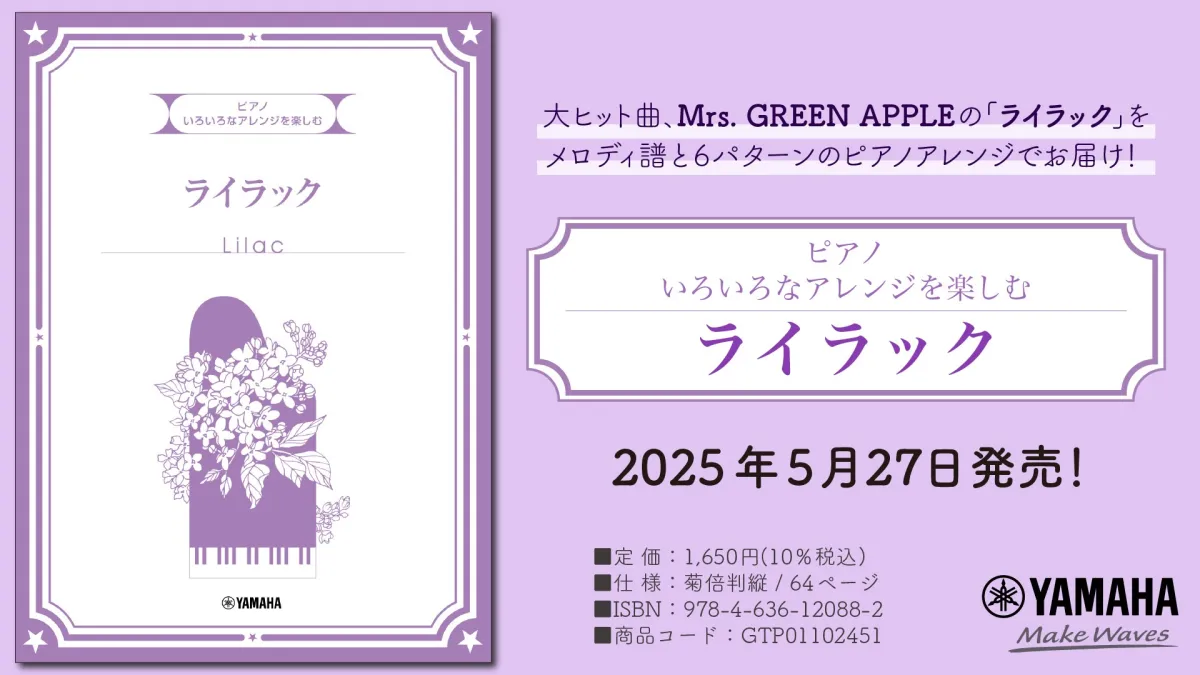 この度、株式会社ヤマハミュージックエンタテインメントホールディングスが手がける新刊「いろいろなアレンジを楽しむライラック」が、2025年5月27日に発売されることが決定しました。この楽譜集は、全国のヤマハ特約楽器店やオンラインショップでの購入が可能です。