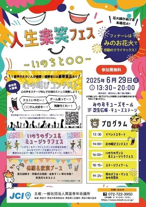 箕面青年会議所が主催する「人生楽フェス〜いのちと〇〇〜」が、2025年6月29日(日)にみのおキューズモールのキューズステージ及びかやの広場で開催されます。心に秘めた思いや偏見、闇を抱えながら生活している私たちが集まり、笑顔になれる一日を過ごす計画です。会場では、様々なアクティビティが用意され、特に心の叫びコンテストが注目を集めています。