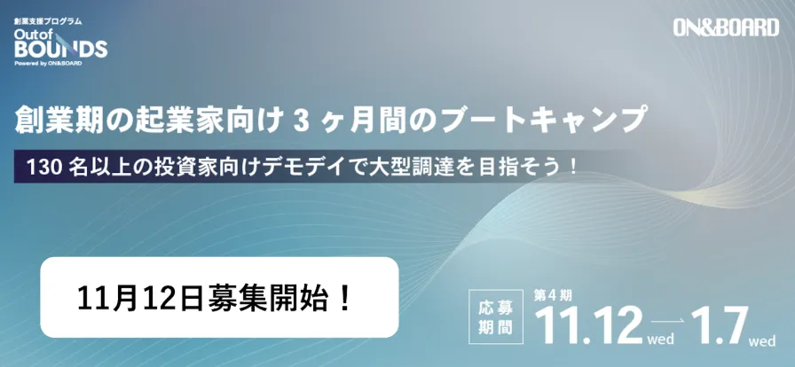 ON&BOARD株式会社は、2023年11月12日(水)より創業支援プログラム第4期「Out of BOUNDS」の参加者募集を開始することを発表しました。このプログラムは、特に革新的な事業テーマの発掘とその実現を支援することを目的としています。