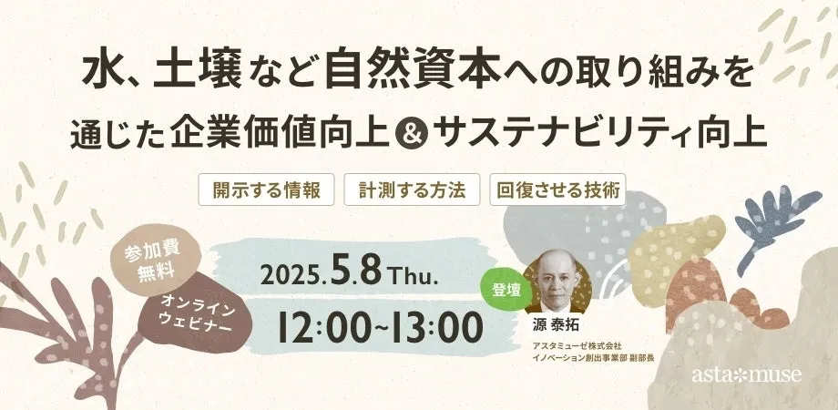 アスタミューゼ株式会社は、2025年5月8日(木)12:00-13:00に、企業のサステナビリティ担当者や興味を持つ方々を対象とした無料ウェビナーを開催します。このウェビナーは、自然資本への取り組みを通じて企業価値向上を目指す内容となっています。
