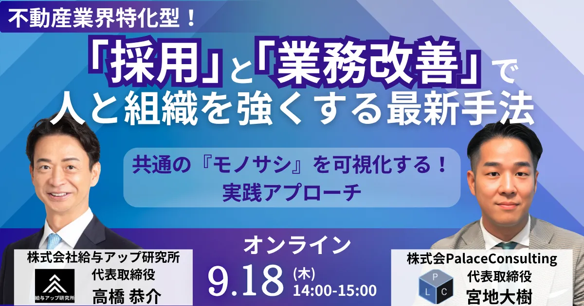 2025年9月18日、オンラインセミナー「不動産業界特化!『採用』と『業務改善』で人と組織を強くする最新手法」が実施されました。このセミナーは、株式会社給与アップ研究所と株式会社Palace Consultingの共催により開催され、離職率の高さや採用の難しさに直面している不動産業界に向けて、実践的なアプローチが紹介されました。