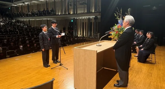 入学式は、学校の校長からの式辞や来賓の祝辞、在校生の歓迎の言葉、そして入学生による宣誓など、多彩なプログラムが展開されました。また、吹奏楽部の生演奏が、新入生の入退場を彩り、式に華やかさを加えました。
