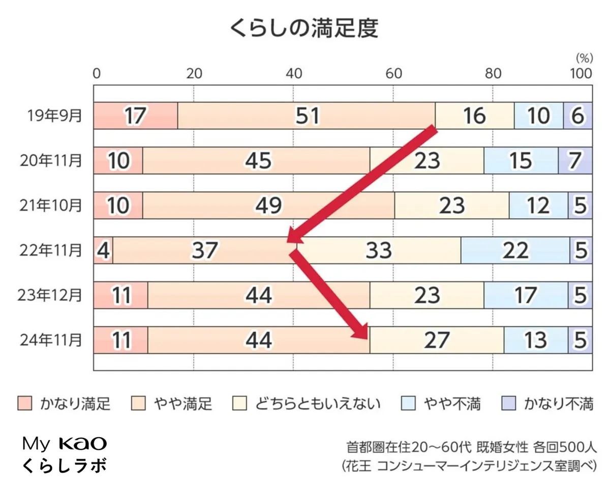 2020年、コロナウイルスの影響で生活満足度は一時的に低下しましたが、その後の2021年には59%に回復。その後、2022年には物価高騰が影響し41%まで落ち込みますが、2023年には再び55%に戻るという変遷を示しました。これは一見すると矛盾するように思えますが、経済的な不安定さの中でも、生活者が工夫をしながら日々を楽しんでいる証拠でもあります。