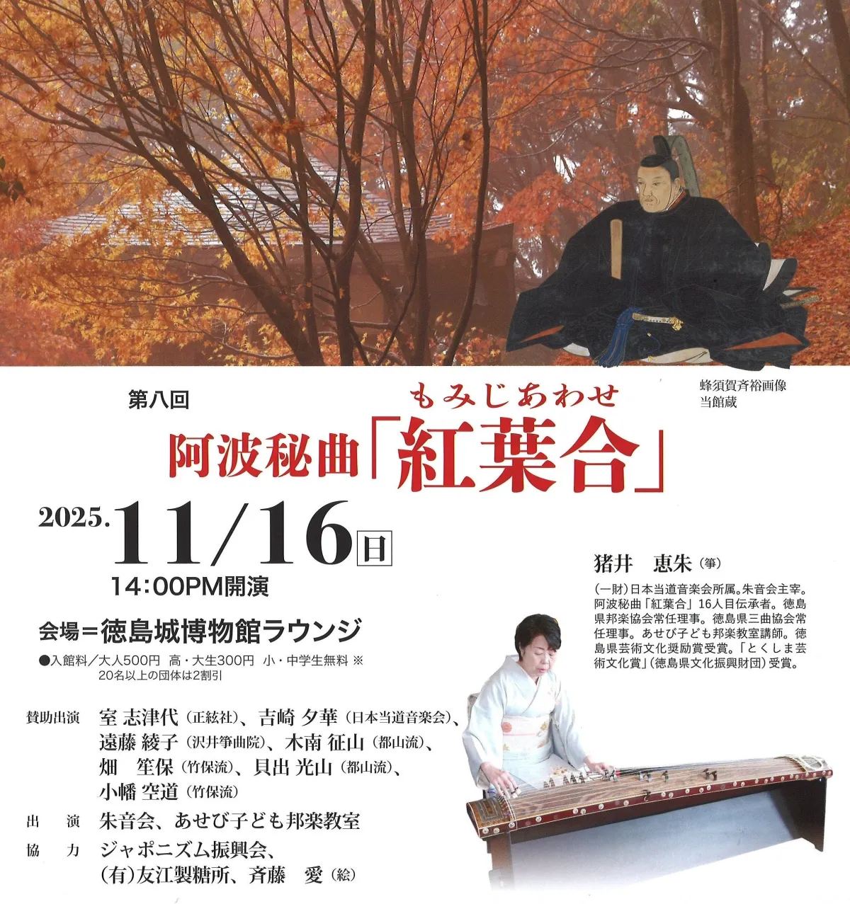 徳島市にて、興味深い邦楽演奏会が開催されます。特に今回は、蜂須賀家にゆかりのある筝曲「紅葉合」が中心となる演奏会です。歴史的な価値のある楽曲を楽しむ貴重な機会ですので、ぜひお見逃しなく。
