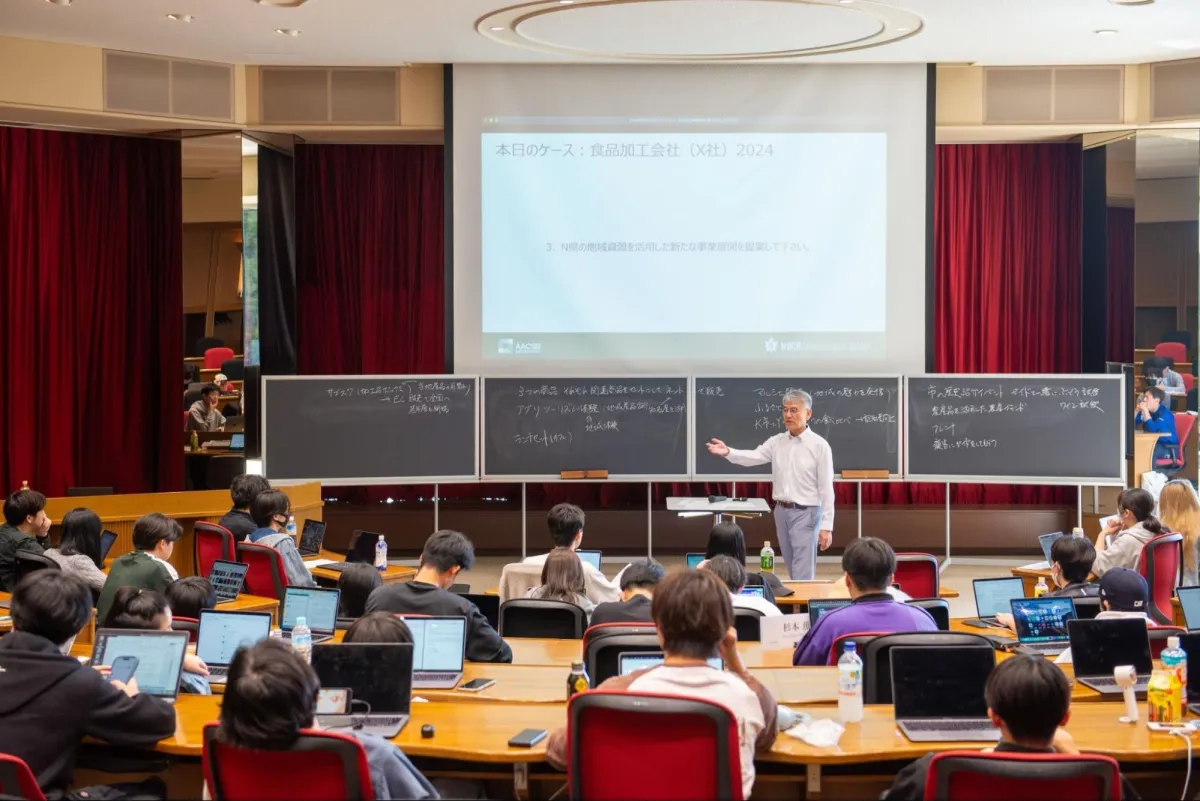 商学部の3年生を対象とした新しい授業「事業構想実践」が始まりました。この授業は、学生が自らビジネスプランを構想するためのもので、特に新規事業の創出に関わる事例を通して、実際の起業家がどのように事業を実現し、関係者と連携を図っているのかを学ぶことが狙いです。授業では「食品加工会社(X社)」が事例となり、その事業が直面している課題に対する解決策を模索します。