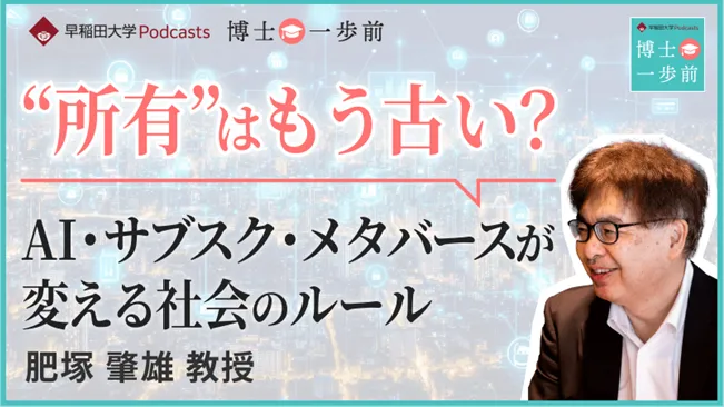 現代社会は目まぐるしい変化の中にあります。特に、AIやサブスクリプションサービスの台頭により、私たちが「所有」と考えていた概念が見直されつつあります。早稲田大学のPodcast番組「博士一歩前」で、法学学術院の肥塚肇雄教授が、これらの変革にどう向き合っていくのかを語ります。