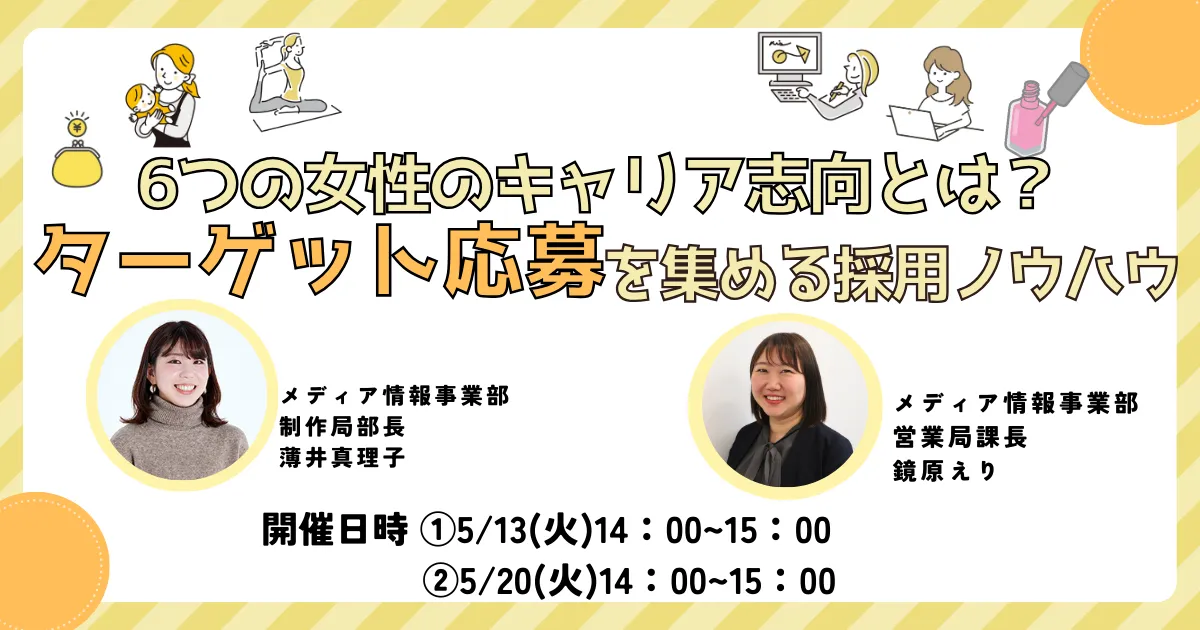 転職サイト「女の転職type」が主催するセミナー「6つの女性のキャリア志向とは?ターゲット応募を集める求人広告ノウハウ」では、特に女性を対象とした採用戦略に注目します。2025年5月13日と20日の二日間、オンライセミナー形式で開催されるこのイベントでは、女性転職者が持つキャリアの視点を深く掘り下げ、企業がどのように効果的なユーザーターゲティングを行えるかを学ぶことができます。