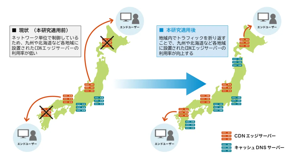 この共同研究の主な目的は、地域判別技術とコンテンツ配信ネットワーク(CDN)技術を駆使することで、地域内でのトラフィックの折り返しを実現することです。その結果、高い配信品質を確保しつつ、ネットワークコストの削減も目指します。