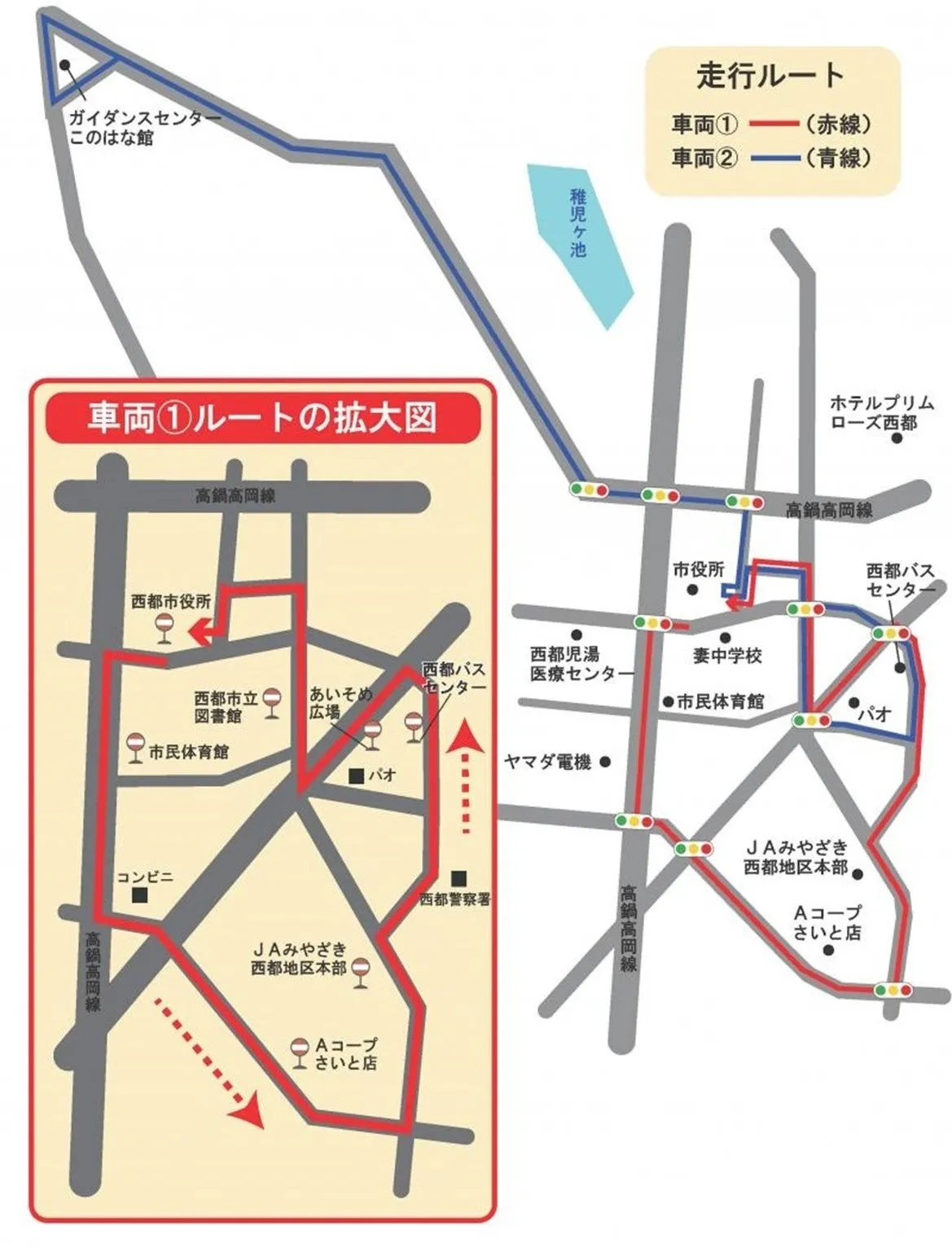 実証運行は宮崎県西都市内の特定エリアにて行われます。具体的には、以下の二つの周遊ルートが設けられています。