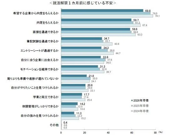 調査によれば、選考への不安が強い項目のトップは「面接」で、58.6%の学生がこれを挙げました。次いで「筆記試験」が34.7%、さらに「エントリーシート」が34.3%と続いています。就活が迫る中での不安要素は、学生にとって大きな心配の種であることが浮き彫りになりました。