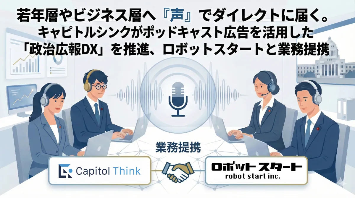 株式会社キャピトルシンクと音声広告のリーディングカンパニー、ロボットスタートが提携し、革新的な「ポッドキャスト政治広告」を発表しました。この取り組みは、特に20代から40代のビジネス層や無党派層をターゲットにしており、これまで届きにくかった層へ候補者の熱意や政策をダイレクトに届けることを目指しています。政治とコミュニケーションの新たな形として、このポッドキャスト広告の可能性が注目されています。