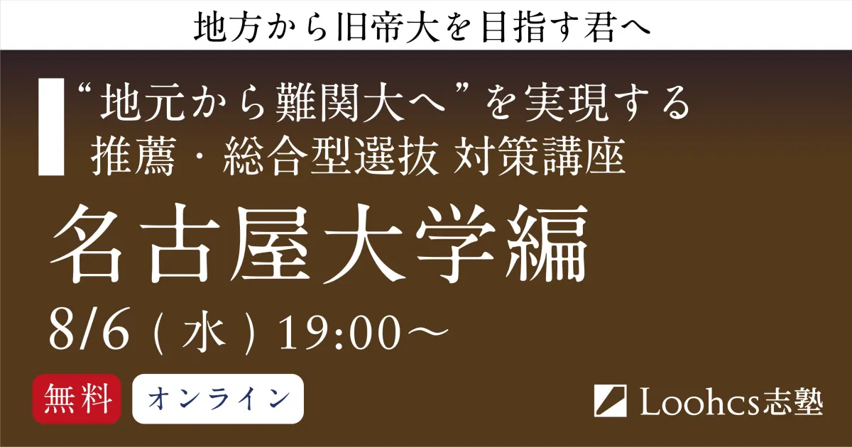 この無料講座では、名古屋大学の推薦入試制度の特徴から、出願書類や面接での評価基準、さらに活動実績の伝え方、志望理由の構築法まで、合格者の傾向を基にした具体的な戦略が学べます。特に、地方の高校生がどのようにして移り変わる入試環境に立ち向かっていくのか、そのための夏の過ごし方や戦略についても詳しく解説します。