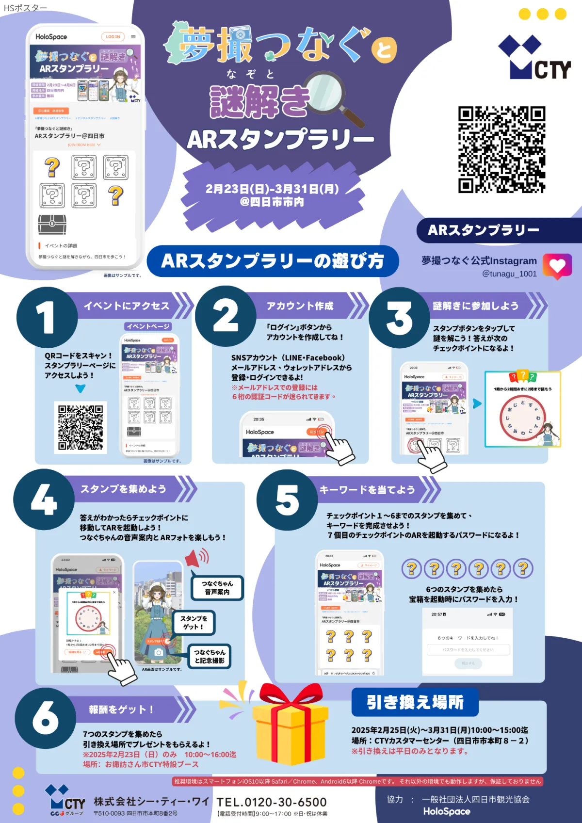 このスタンプラリーは、スマートフォンやタブレットから簡単に参加できる新感覚のイベントです。訪れる先々に設置されたチェックポイントでは、謎を解きながら四日市市中心市街地を巡ります。参加者は、CTY/CNSのバーチャル社員である「夢撮つなぐ」と一緒に、AR(拡張現実)技術を使っているため、実際の風景に新たな楽しみを加えながら冒険ができます。