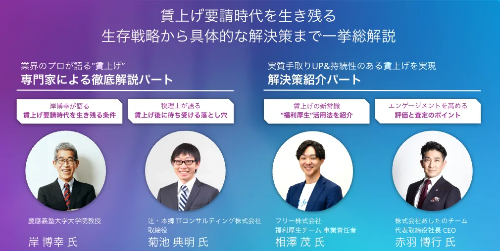 「給与を上げない賃上げ徹底攻略ガイドブック」では、経済アナリストの岸博幸氏や、辻・本郷ITコンサルティングの菊池典明取締役など、各業界の専門家が参加したセミナーを通じて得られた知見をもとに、新たな賃上げ戦略を提案しています。従業員のニーズに応えながら、企業の経済的負担を抑える方法について具体的なアドバイスが満載です。