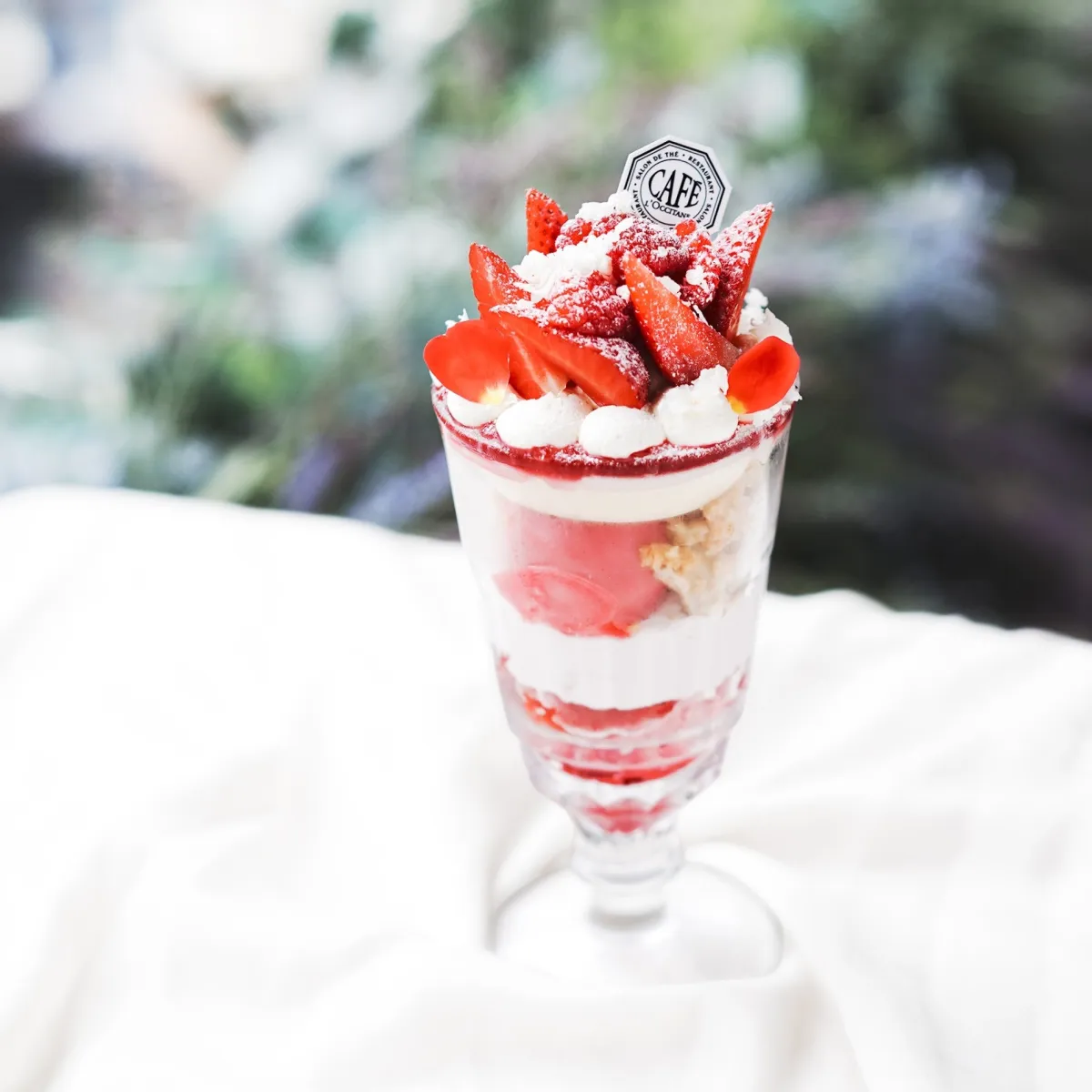まずご紹介するのは「ベリー&ローズパフェ」。税込1,980円で、渋谷店限定のこのパフェは、華やかなローズとミルキーなホワイトチョコレート、さらに甘酸っぱいベリーが絶妙なバランスで組み合わさっています。フレッシュな苺とラズベリーの酸味が、濃厚なホワイトチョコレートムースや香り高いローズゼリーと重なり、口の中で優雅に広がります。特に、ダマスクローズジャムを使用したホイップクリームと、甘酸っぱいラズベリーソースがトッピングされており、アーモンドクランブルの食感が楽しむポイントにもなっています。このパフェは、冬の訪れを告げる贅沢な甘味で、特別なひとときを演出してくれること間違いなしです。