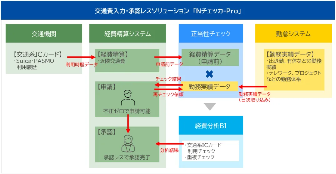 「Nチェッカ-Pro」は、経費精算システムと勤怠システムを連携させることで、交通費精算にまつわる手続きの効率を飛躍的に向上させることを目的とした製品です。具体的には、SuicaやPASMOの利用履歴をリアルタイムで取得し、自動的に経費精算システムに反映させる仕組みを備えています。これにより、申請者は手動で交通費を入力する必要がなくなり、ミスや不正のリスクを低減することが可能になります。