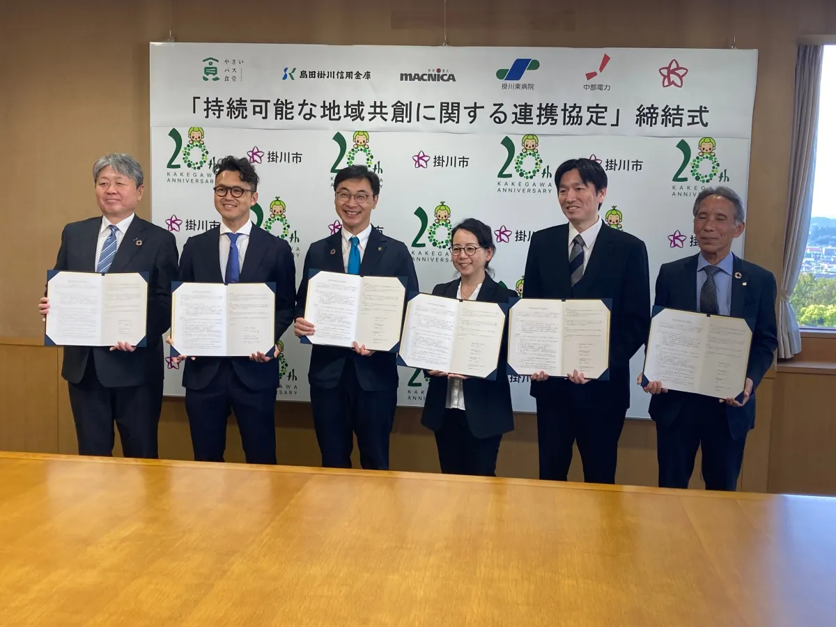掛川市は現在、人口減少や高齢化、環境や経済の問題と向き合っています。こうした状況を鑑み、市は「地域のすべての人や組織が前向きにまちづくりに関わる」という方針のもと、官民連携による共創型プロジェクトを進めています。この度、やさいバス食堂を含む5社(島田掛川信用金庫、株式会社マクニカ、医療法人社団綾和会 掛川東病院、中部電力株式会社)が、この共創の理念に賛同し、持続可能な地域共創に向けた協定を同時に結ぶ運びとなりました。