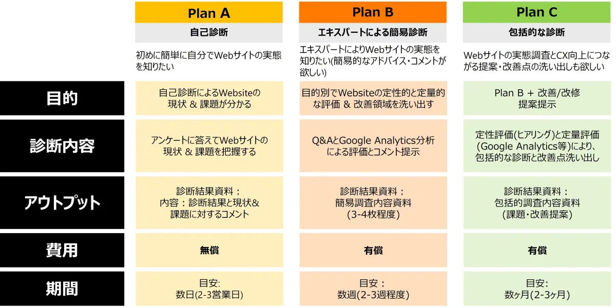 この新サービスでは、企業のWebサイトを分析し、顧客体験向上のために必要な改善策を導き出します。アセスメントは大きく三つのプランに分かれており、顧客のニーズに合わせた対応が可能です。まず、無償のPlan Aは自己診断形式で、ユーザーがアンケートに答えることで簡単に現状を把握できます。さらに、Plan BではGoogle Analyticsのデータを活用し、CX専門家とのヒアリングを通じて簡易的な診断を行います。最後にPlan Cは、専門スタッフが詳細なヒューリスティック分析を行い、包括的な診断を実施します。