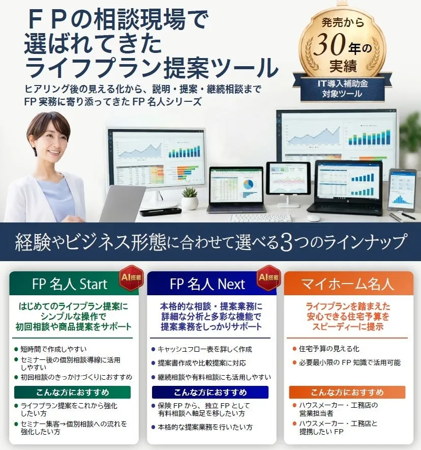 当社は、このようなニーズに応えるために、「FP名人」シリーズとして、三つの特長を持つライフプランツールを提供しています。それぞれのツールの活用法をより多くの方に知っていただくため、無料のオンライン説明会を実施します。これにより、実務の現場で必要とされるライフプラン提案の幅を広げる手助けができればと考えています。
