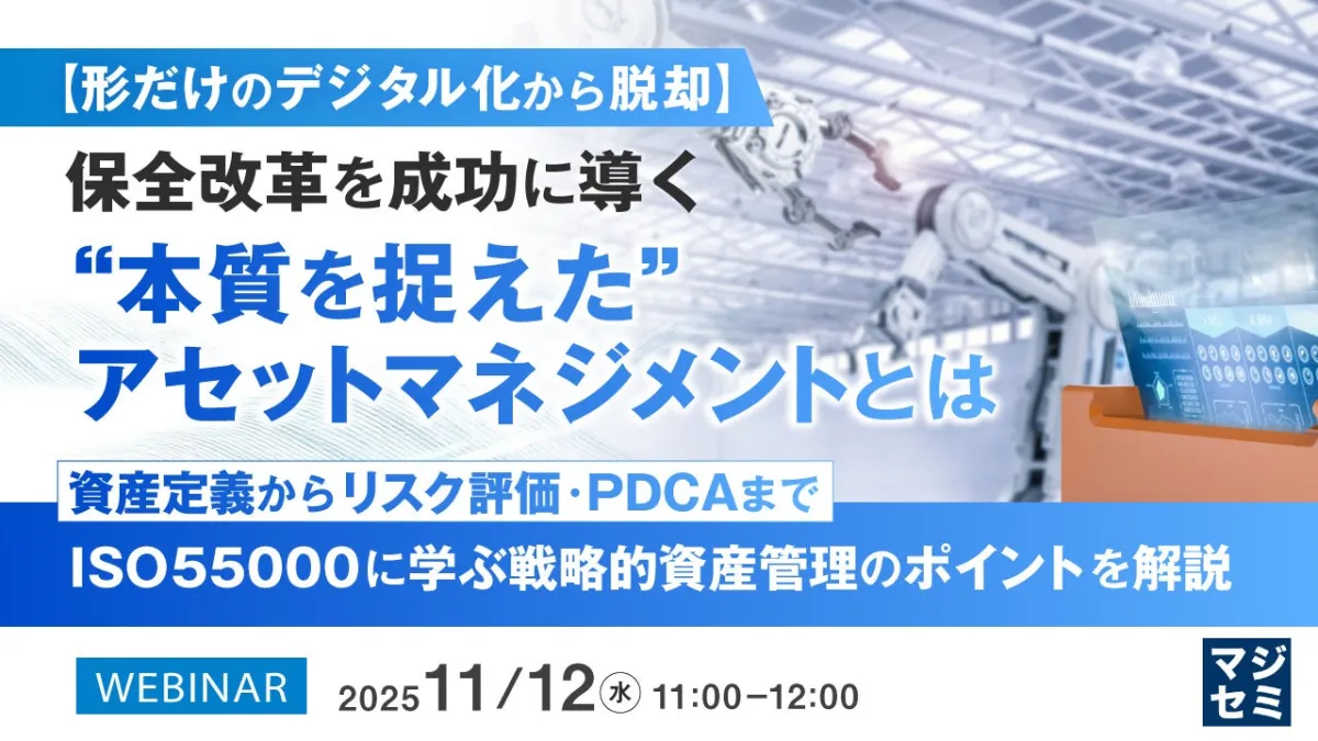 本ウェビナーでは、「保全のデジタル化がなぜ成果につながらないのか」をテーマに、国際規格ISO 55000に基づいた戦略的アセットマネジメントの実践方法を紹介します。これには、管理すべき資産の特定、リスクに応じた優先順位付け、限られたリソースの効果的な配分、収集したデータの全社的な活用及び改善サイクルへの展開が含まれます。