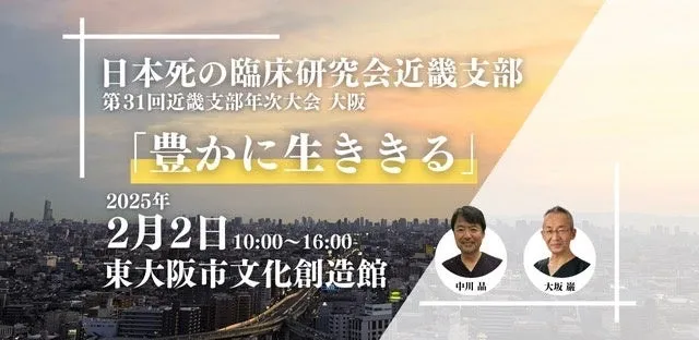 一般社団法人日本死の臨床研究会が主催する第31回近畿支部年次大会が、2025年2月2日(日)に東大阪市文化創造館小ホールで行われます。この大会では、「豊かに生ききる」というテーマのもと、医療・介護・福祉の専門家と一般市民がともに考える機会が提供されます。