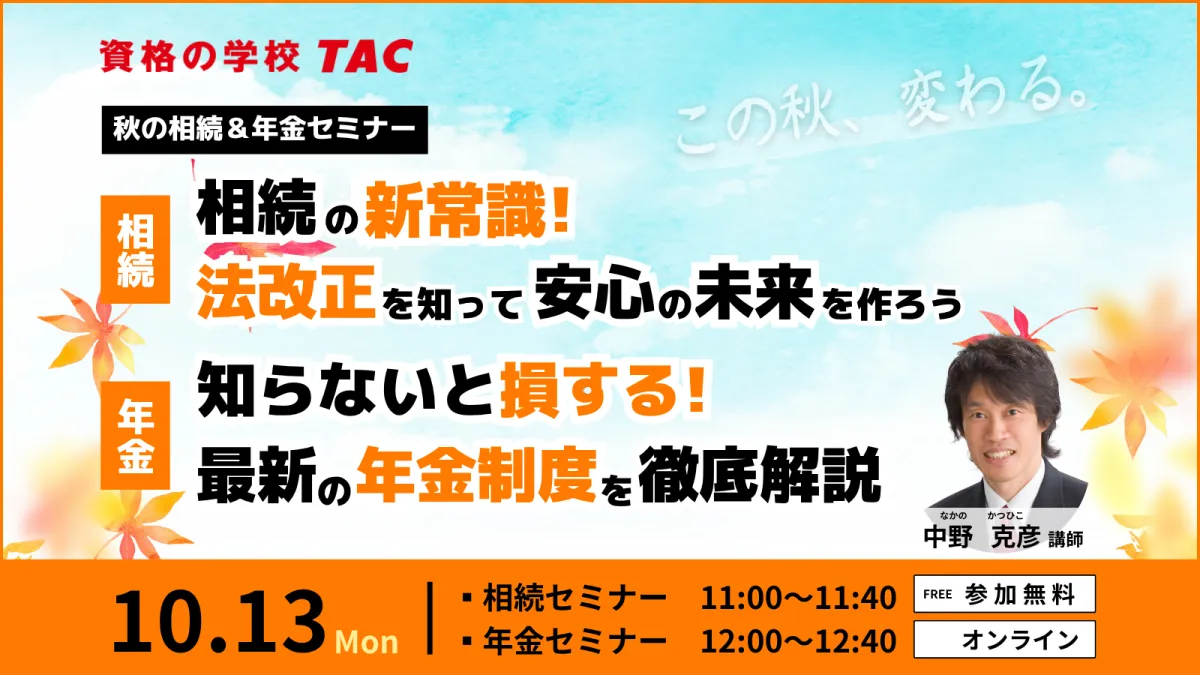 TAC株式会社は、人生100年時代において重要な金融知識を楽しく学べる「秋の相続・年金セミナー」を、2025年10月13日(月祝)に開催します。セミナーは無料で参加でき、Zoomを通じてウェビナー形式で行われるため、どこからでも安心して受講することができます。