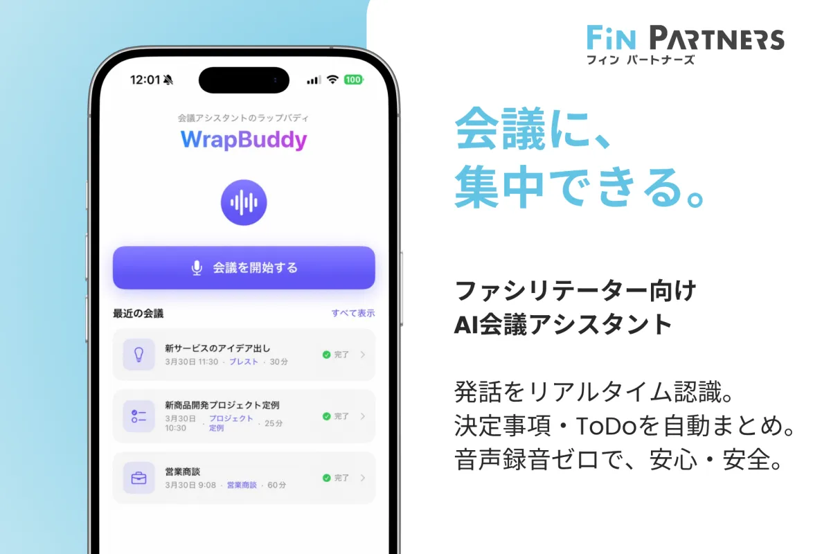 ビジネスシーンにおいて、会議のファシリテーターは多くの役割を同時に担うことが求められています。議論をリードしつつ、議事録やToDoの管理を行うことは非常に負担が大きく、特にオンライン会議においては録音機能が制限されることも多く、情報の記録や共有に苦労することが少なくありません。こうした課題を解決するために、Fin Partnersは「会議に集中できる環境をすべてのファシリテーターに」という理念のもと、WrapBuddyを開発しました。
