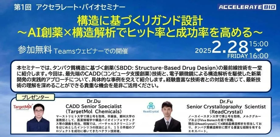 2025年の2月28日、午後3時から開催される『アクセラレート・バイオセミナー』では、創薬やライフサイエンス研究における最先端の技術が一堂に紹介されます。特に注目したいのが、構造に基づくリガンド設計に関連する技術です。セミナーには、Dr.DU(CADD Senior Specialist, TargetMol)とDr.FU(Senior Crystallography Scientist, ReadCrystal)という2名の専門家が登壇し、AI創薬と構造解析の融合がどのように新薬開発を加速させているのかを詳しく解説します。
