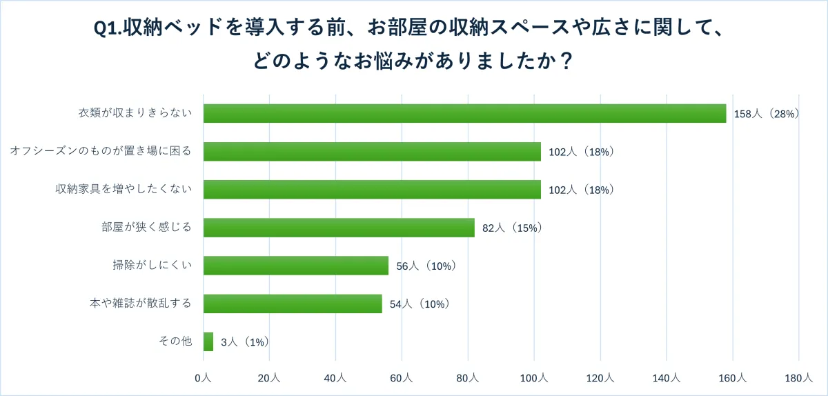 アンケート結果によると、最も多い悩みは「衣類が収まりきらない」というもので、次に「オフシーズンのものの置き場に困る」という声も多く寄せられました。他にも「部屋が狭く感じる」「整理整頓ができていない」といった意見もあり、収納の課題は多岐にわたります。