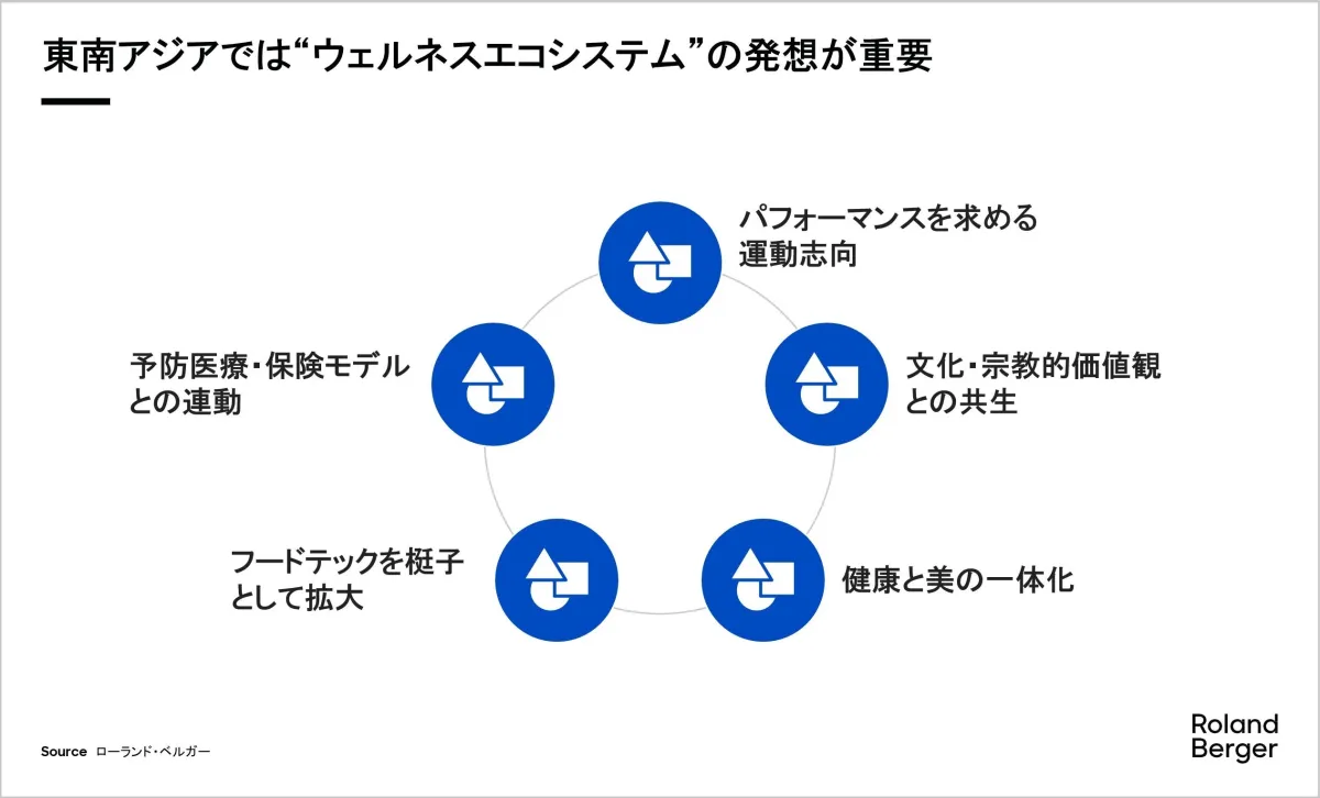 東南アジアのウェルネス市場は、文化やトレンドの多様性が共存する活気あるフィールドです。その中で日本企業が成功するためには、単発的な戦略ではなく、総合的なアプローチを取り入れたウェルネスエコシステムの構築が必要とされています。レポートの詳細は、株式会社ローランド・ベルガーのサイトからダウンロード可能です。