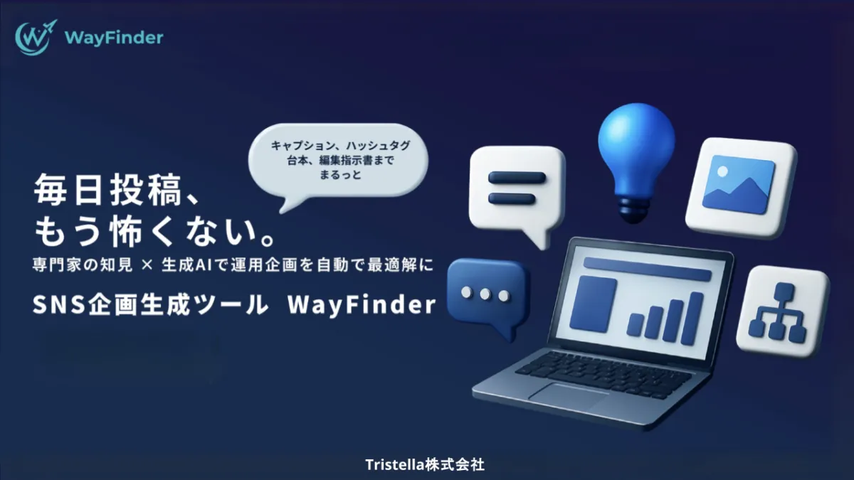 生成AIの進化によって、テキストや画像の生成コストが劇的に下がる一方で、SNS運用における「成果が出る企画の立案」は依然として人間の経験則や感覚に依存しています。WayFinderは、その解決策として、SNS運用のプロと連携することで、自動化を推進し、実績に裏打ちされた高品質な企画案をユーザーに提供することを目指しています。