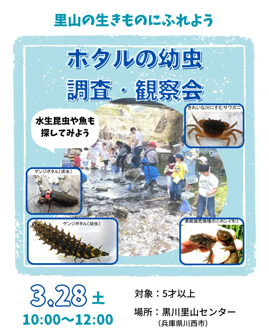 2026年3月28日に兵庫県川西市の黒川里山センターで、「ホタルの幼虫調査・観察会」が開催されます。このイベントでは、ゲンジボタルの幼虫を観察し、里山の生き物たちに触れる貴重な体験ができます。大阪から車で約1時間と、手軽に参加できる距離です。