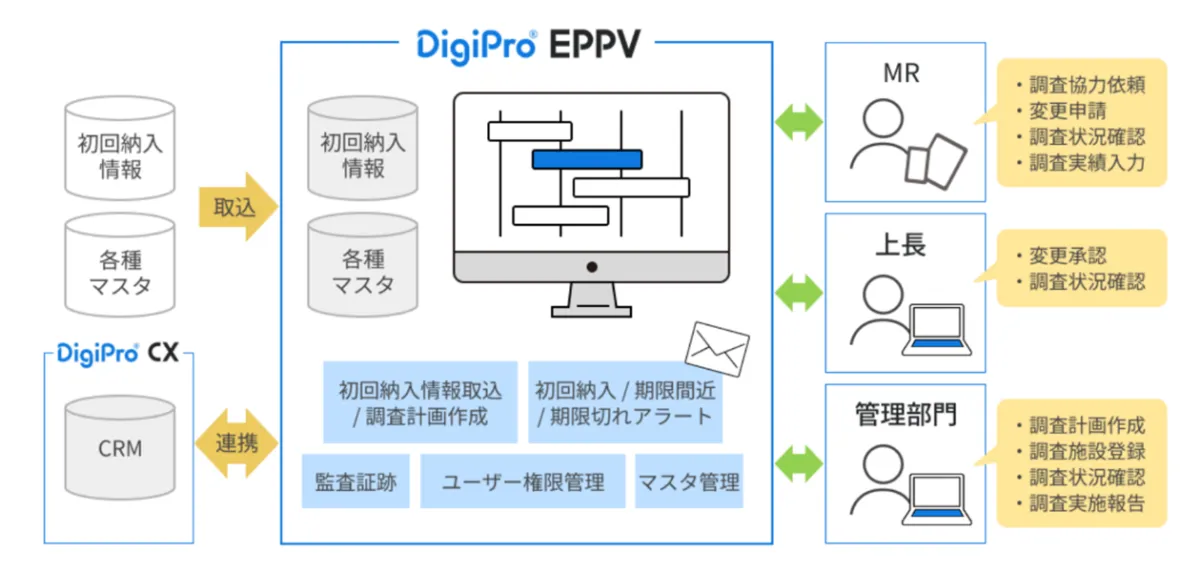 「DigiPro® EPPV」は、製薬企業のニーズに応える多機能なツールです。効率的な業務を実現するための多彩な機能を提供しており、特に医薬品の安全性情報管理においては、信頼性を確保するための必要なCSV(Computerized System Validation)対応サービスも揃っています。この新サービスは単独でも利用できる一方で、既存のDigiPro CX(CRM製品)と組み合わせることで、さらに大きな効果が期待できます。