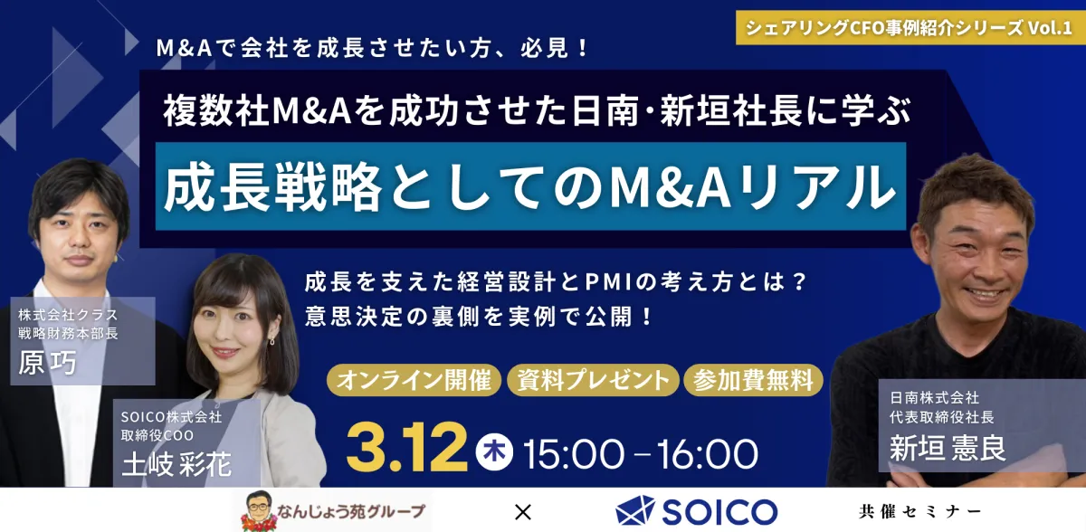 このセミナーは、M&Aを通じて企業成長を目指す経営者やCFO、事業責任者の方々に向けて実践的なノウハウを提供することを目的としています。複数のM&Aを成功させてきた日南株式会社の新垣憲良社長がゲストスピーカーとして登壇し、実際の取引に基づいた具体的な判断基準や成功の要因について深く掘り下げます。