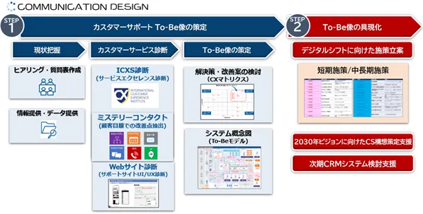 CTCが提供する「コミュニケーションデザイン」サービスは、顧客のニーズと行動に基づき、理想的なCXを構築するためのコンサルティングです。OGMの状況に応じたアセスメントが行われ、実現可能な「To-Beモデル」が設計されます。これにより、短期的および中長期的な施策が検討されます。