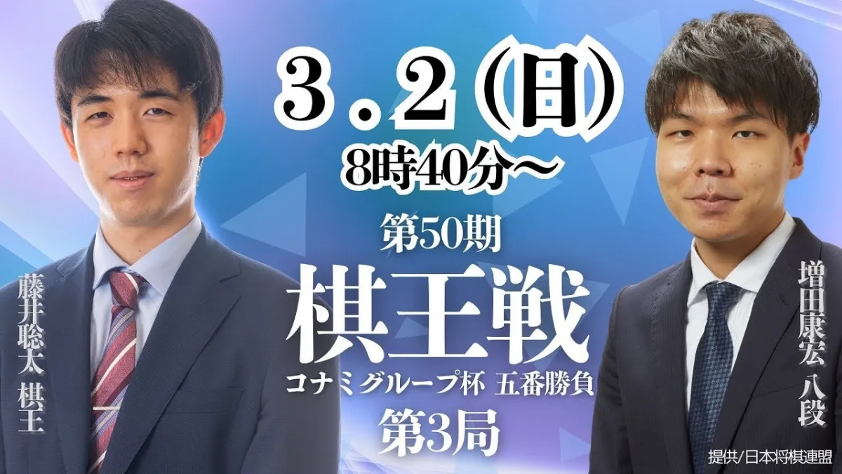 将棋ファン待望の瞬間がやってきます。3月2日(日)に行われる『第50期 棋王戦コナミグループ杯 五番勝負』第3局において、藤井聡太棋王と増田康宏八段が一堂に会します。この重要な対局を、生中継でお楽しみいただけるチャンスが到来しました。