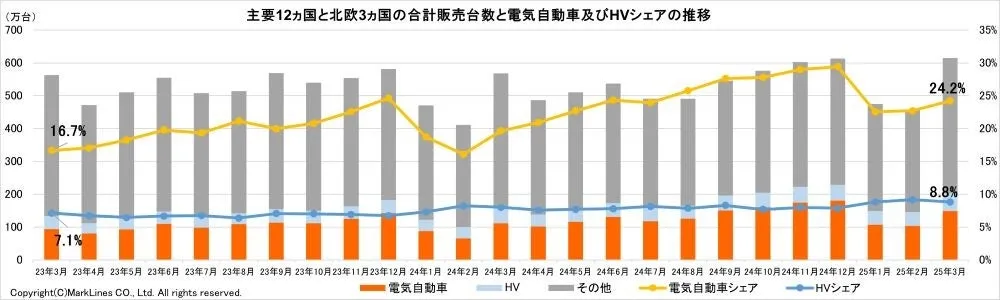 2025年3月、全体の電気自動車販売台数は149.0万台に達し、前月比で43.3%、前年同月比では33.4%の大幅増となりました。この成長は、中国や英国をはじめとする国々での新車販売全体の上昇によるものです。特に米国では、追加関税の前に駆け込み需要が見られたことが市場を押し上げています。