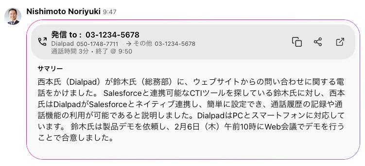 この最新のAi機能は、Dialpadのアーリーアダプタープログラム (EAP) に参加している60社以上の国内企業でも先行導入されており、実証済みの成果が得られています。「DialpadのAi機能によって業務が根本的に変わりました。」と、ある企業の担当者は話します。電話の対応ログにかかる時間が半分以下に短縮されたことにより、品質管理も強化されているとのことです。