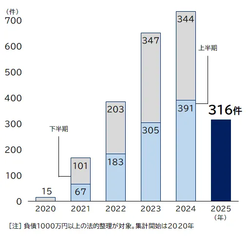 帝国データバンクの最新の調査によると、2025年の上半期において、政府系および民間金融機関から提供された実質無利子・無担保融資(通称、ゼロゼロ融資)を受けていた企業が倒産した件数が316件に達することが明らかになりました。これは、前年同期の391件よりも75件の減少を示しましたが、過去3年連続で300件を超える結果となっています。