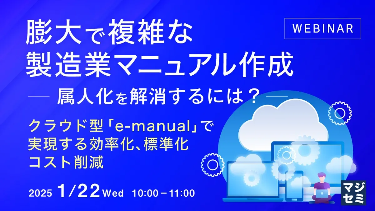 製造業におけるマニュアル作成は、技術者にとって大きな負担となっています。膨大なページ数と多言語翻訳、さらには複雑なレイアウト調整に追われ、本来の設計や開発業務に多くの時間を割くことが難しい現状があります。この問題を解消すべく、今般『膨大で複雑な製造業マニュアル作成――属人化を解消するには?』をテーマにしたウェビナーが開催されます。このウェビナーでは、技術者が直面するマニュアル作成の負担を軽減し、より効率的な手法を学ぶ機会となります。