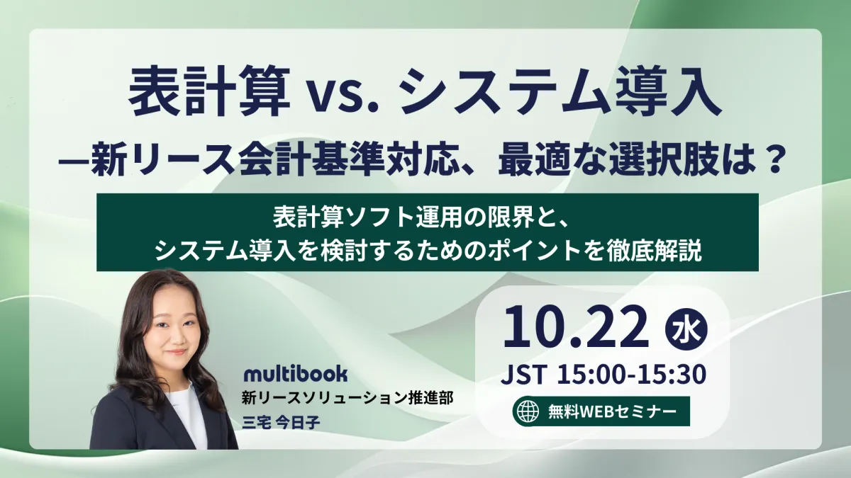 株式会社マルチブックは、東京都品川区に拠点を置く企業で、グローバルクラウドERPサービス「multibook」を提供しています。この度、同社は無料のウェブセミナー「表計算 vs. システム導入——新リース会計基準対応、最適な選択肢は?」を開催することが決定しました。このセミナーでは、表計算ソフトでの対応が抱える限界と、システム導入による効率化の可能性について詳しく解説します。